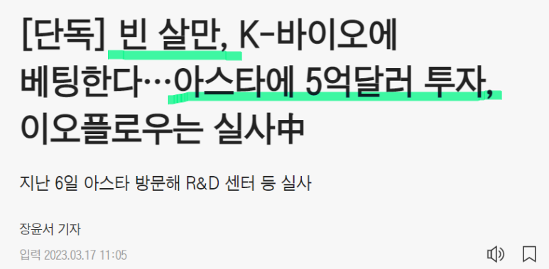 오늘은 미스터 에브리띵 빈 살만이 투자한 K-바이오 아스타에 대해 알아보겠습니다.