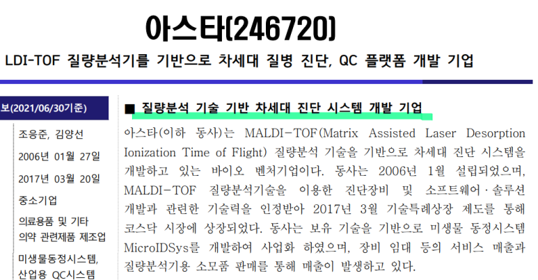 아스타는 말디토프 질량분석을 활용하는 산업용 분석검사장비로는 국내에서 유일한 회사입니다.