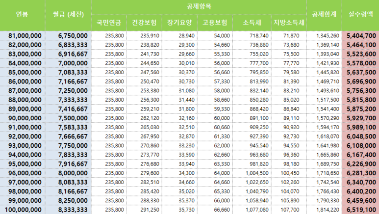 연봉 4,000만 원을 넘게 되면 이때부터 실수령액 300만 원 구간입니다.